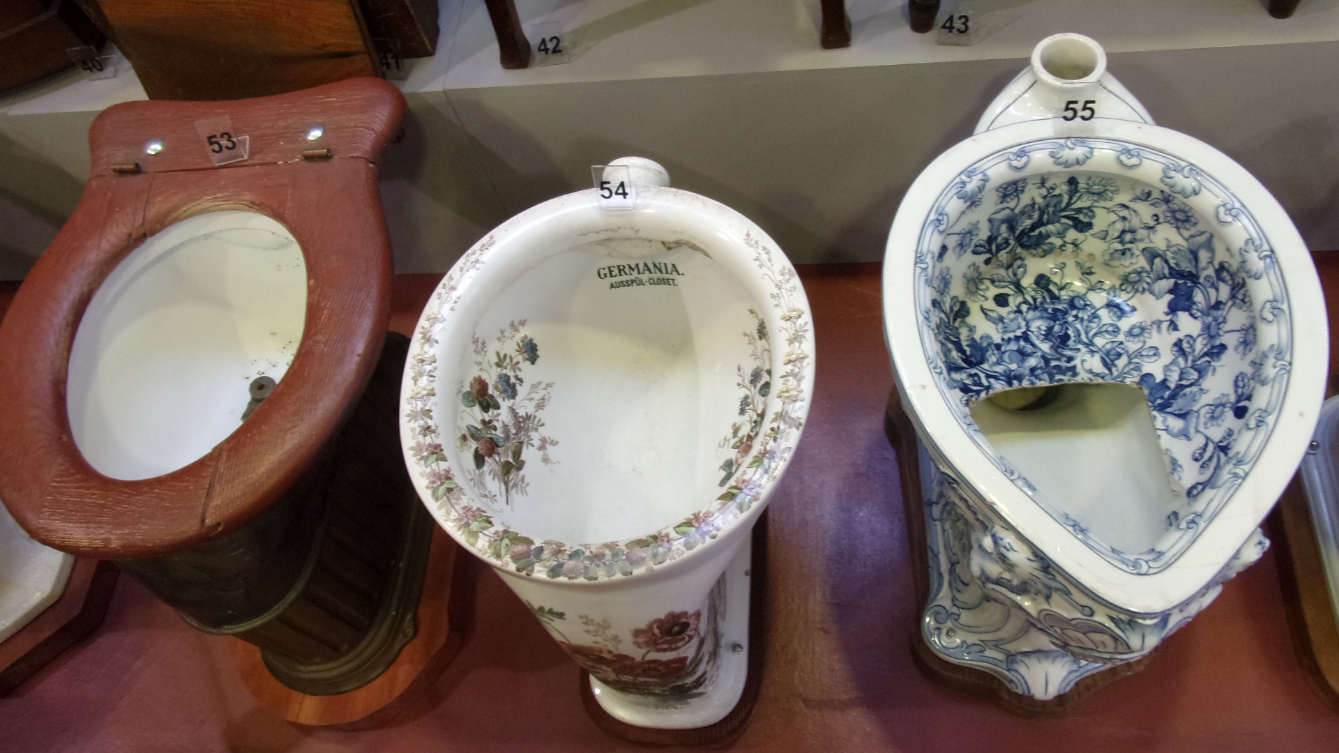 Por fortuna, el museo no tiene ningún olor en particular: ni a cloro ni a orina ni a mierda. De hecho, si no fuera por la información histórica, el primer piso parecería más una sala de muebles e inodoros como los de los grandes almacenes para el hogar. Se ven sillas y mesas de madera -estas últimas parecen tocadiscos-, al igual que retretes de cerámica como el que usted o yo tenemos en casa, con una variación: las sillas y mesas tienen un pequeño compartimento para el excremento y la orina, mientras que los retretes de loza están decorados con flores y plantas al estilo Art Nouveau.