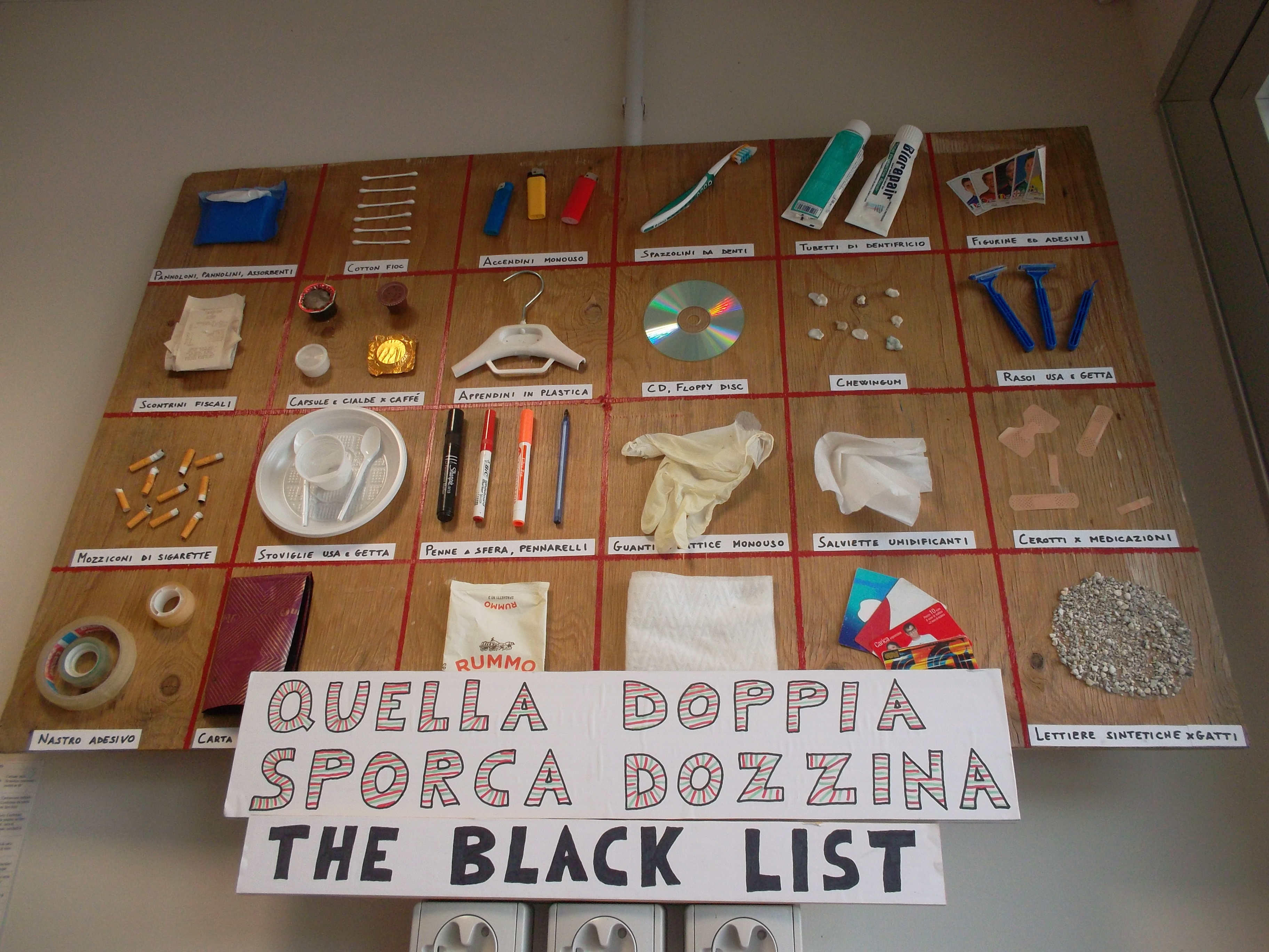 La lista negra, la docena doblemente puerca: veinticuatro artículos que no se pueden reciclar o son de un solo uso: recibos, un CD, cepillos dentales, cigarrillos, cuchillas de afeitar, vajillas, encendedores de plástico y calcomanías. Luego le sigue una mesa y una gaveta donde reposa el letrero de “Pequeño museo de los errores de diseño” para los productos problema: más recibos térmicos, cremas dentales, la máscara de un monstruo de Halloween. Encima, las soluciones, los sustitutos a la cultura de lo desechable: copa menstrual, cepillos dentales de bambú, cuchillas de metal y álbumes sin adhesivos.